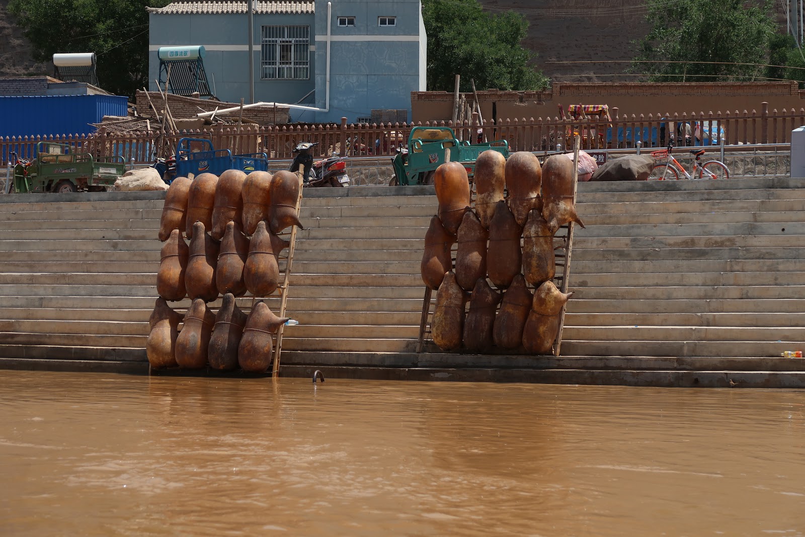 We drifted down the Yellow River on goat skin raft. The animal body and skeletons are skillfully extracted and the skin are then processed to make it watertight before air is pumped in and sealed to act as a floatation device. About dozen of these animal floats are then tied neatly together. A wooden platform is rigged on top of the goat skin floats to form a raft. It was the ancient way of river transportation. See picture below.
